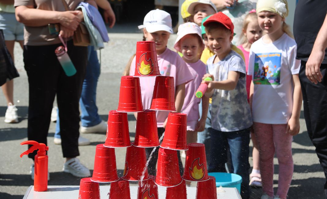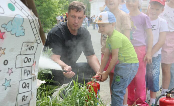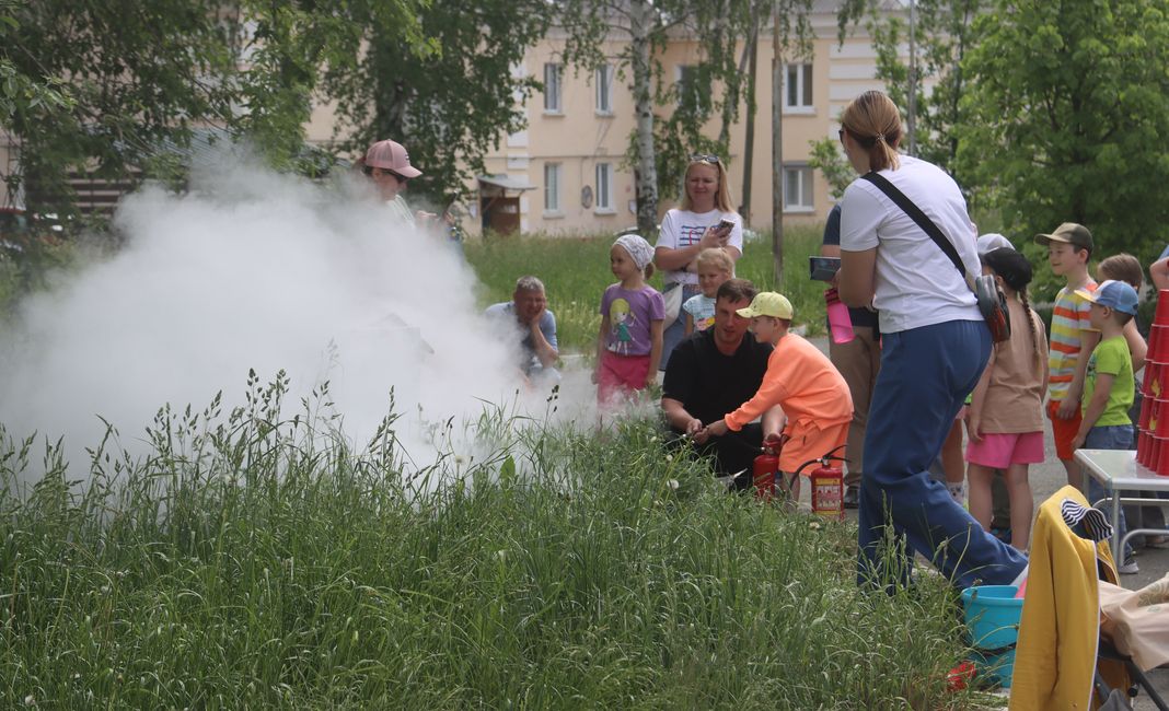 Тем временем на соседней станции звучит весёлое многоголосье – это закончилась теоретическая часть и началась практика. Даже самые маленькие участники пробуют потушить условный пожар из настоящего порошкового огнетушителя. И ведь получается – картонный домик спасён!