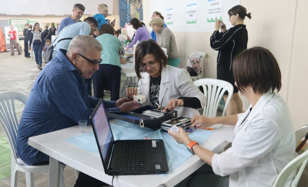 Большой зал «Юности» действительно заполнен желающими провести чек-ап организма и больше узнать о здоровьесберегающих технологиях. Особый интерес вызывает секция Центра промышленной медицины с аппаратом для паллестезиометрии – методом оценки чувствительности, используемым для ранней диагностики нарушений периферической нервной системы. Эксперты проводят обследование и дают полезные советы.