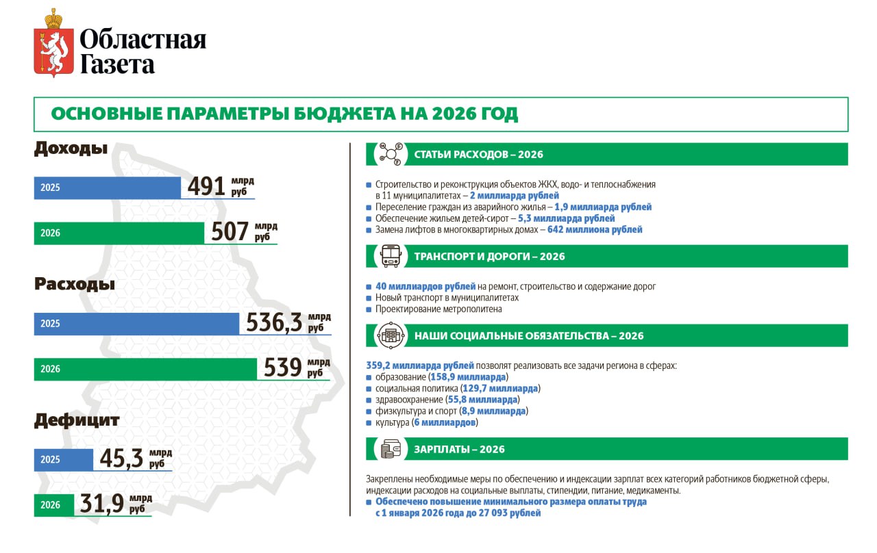 Также запланировано строительство и реконструкция очистных сооружений в Среднеуральске и Сысерти на сумму более двух миллиардов рублей. Объекты газификации будут созданы в четырёх муниципальных образованиях. Дорожный фонд в 2026 году вырастет на миллиард рублей и составит 40 миллиардов.