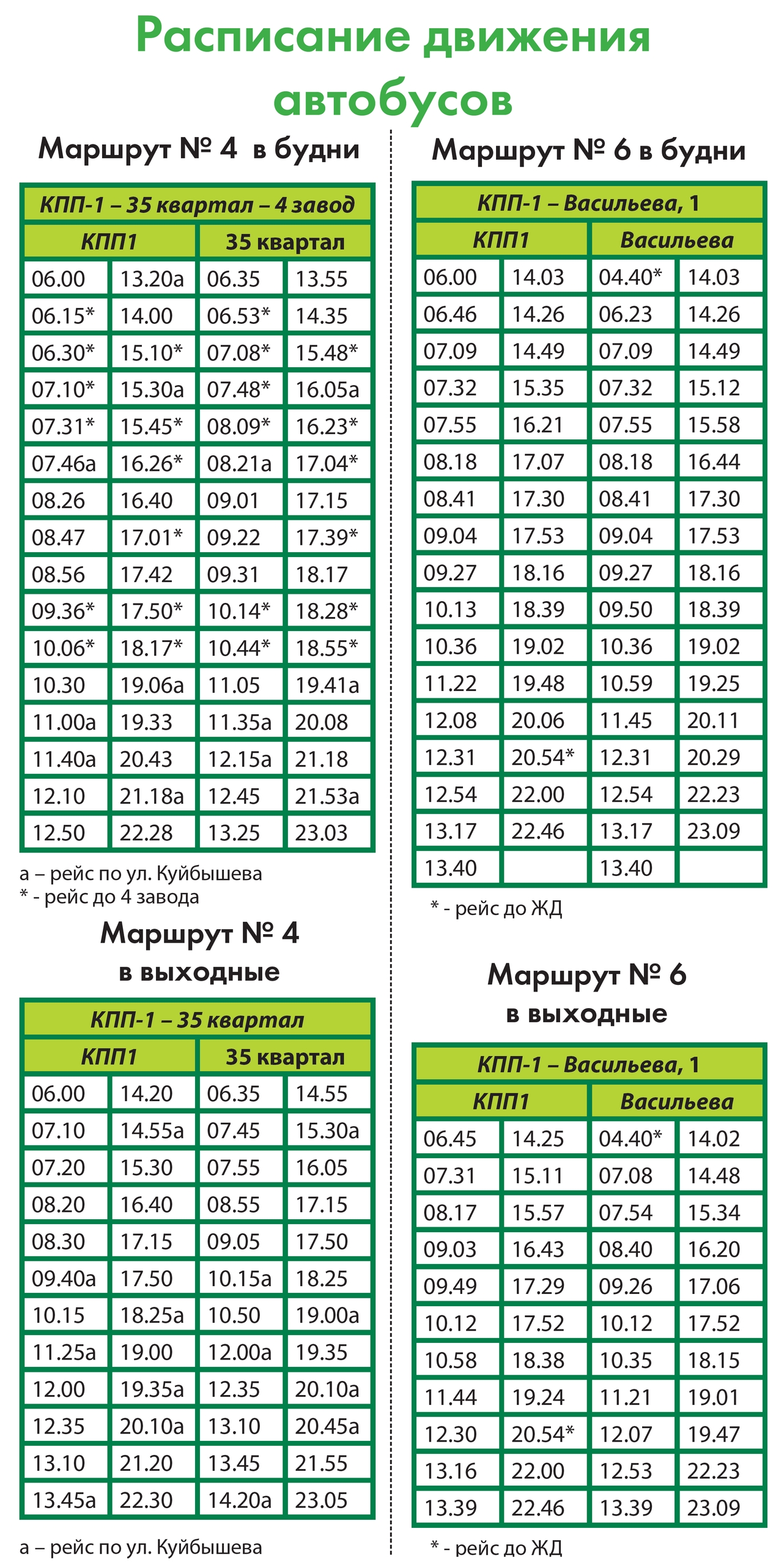 При качественном изменении транспортной составляющей новый муниципальный контракт сохранил перечень и расписание автобусных маршрутов. Для удобства горожан дополнительно публикуем расписание маршрутов № 4 и № 6 в будни и выходные дни.