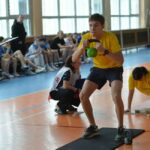 2 этап – прохождение дистанции с выполнением упражнений: прыжок в длину с места (не меньше 160 см – юноша, 140 см – девушка, 5/3 раза); отжимания (4/3); приседание с гирей (8 кг/4 кг, 6/6 раз), поднимание туловища из положения лёжа (15/10), бёрпи через скамью (5/4). Выполнив задания, участник возвращался к месту старта и касанием передавал эстафету товарищу.