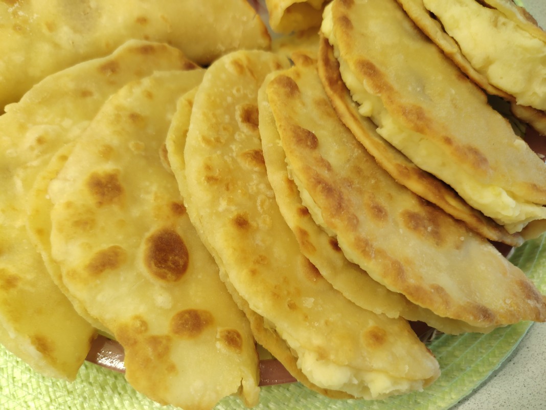 Начинка готова, вернёмся к лепёшкам. Заранее растопите сливочное масло. Тесто разделите на шарики диаметром 5-7 см и раскатайте в тонкие лепёшки. Разогрейте сковороду и обжарьте с обеих сторон до румяной корочки. Готовые лепёшки сразу накрывайте крышкой, чтобы они были мягкими.