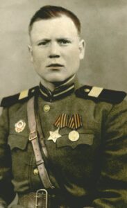«С войной я встретился в Белоруссии, когда войска Первого Белорусского фронта вели бои местного значения. Мы отвоёвывали «высотки», выравнивали линию фронта, словом, были на самой передовой. Так велась подготовка операции «Багратион», которая должна была начать освобождение Белоруссии от фашистов. Самое удивительное, что в тот период я не был даже ранен. В начале июня 1944 года планировалось большое Бобруйское наступление. Помню, как нас в первый раз приехали «обкатывать» (учили не бояться), мы сидим в окопах, а вокруг нас ездят танки. Вскоре меня перевели в другое подразделение, и я сам сел за рычаги боевой машины. Это была самоходная установка СУ-100. На ней в составе танковых войск генерала Бахарева я участвовал в Бобруйском наступлении. В тех боях, а именно 24 июня 1944 года, был тяжело ранен – проникающее ранение в голову. Лежал в госпиталях. Потом снова маршевая рота и фронт».