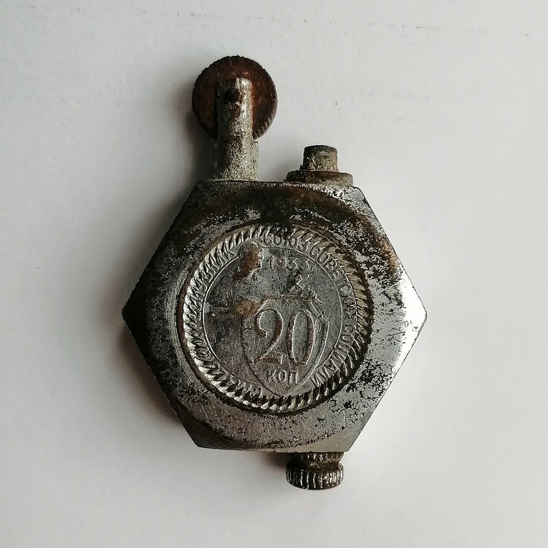 – Это самодельная зажигалка, – пояснила Анна Сергеевна. – Её корпус сделан из двух 20-копеечных монеток и большой гайки. Найдена она была в районе посёлка Мясной Бор во время поисковых работ и в числе других предметов солдатского быта передана в наш музей.