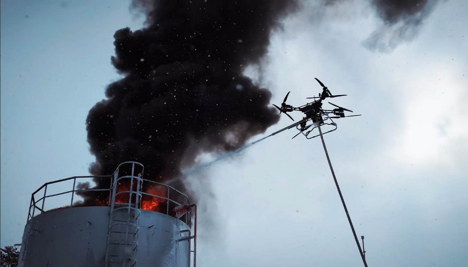 В ходе испытаний дрон в связке с наземной установкой компрессионной пены «NATISK» ликвидировал возгорание резервуара с горючей жидкостью всего за 3,5 минуты. Аппарат провёл тепловизионную разведку и подал огнетушащее вещество с высоты 12 метров, подтвердив эффективность работы в условиях экстремальных температур и риска взрыва.