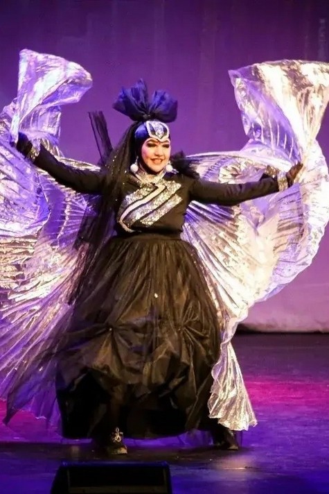 Самой эффектной частью костюма были «крылья» из металлизированной ткани. Стоило мне только поднять руки, как они расправлялись широкими дугами и переливались, будто это не ткань, а что-то волшебное! Образ дополнял высокий головной убор с украшением на лбу, он делал силуэт выразительным и привлекал внимание публики.