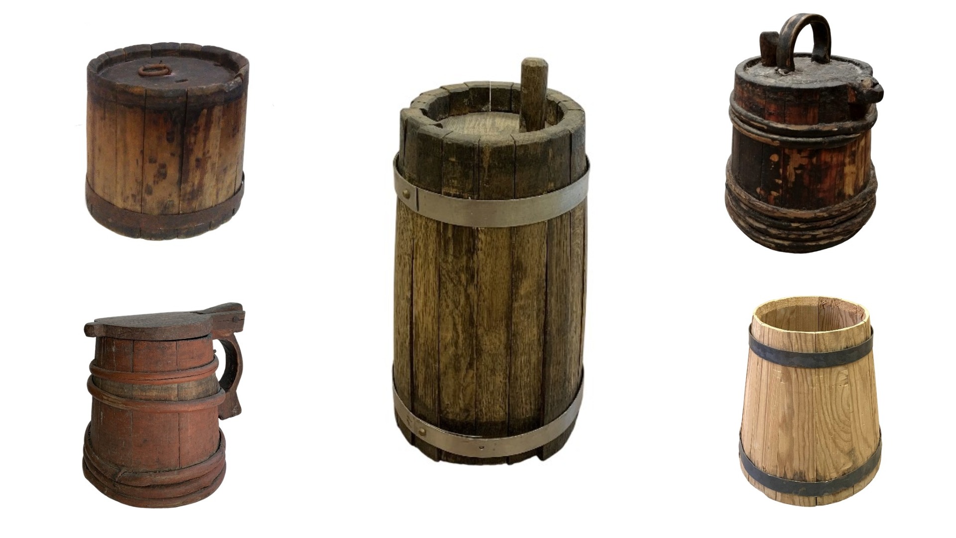 Бочки, кадки, вёдра, ушаты, лохани, шайки, окорёнки, жбаны, сбойки, бадьи, чаны, дошники, лагуны – множество разных ёмкостей для разных целей изготавливали бочары. Все они собираются из отдельных клёпок и скрепляются в обхват обручами, те что поменьше – деревянными, большие – железными.