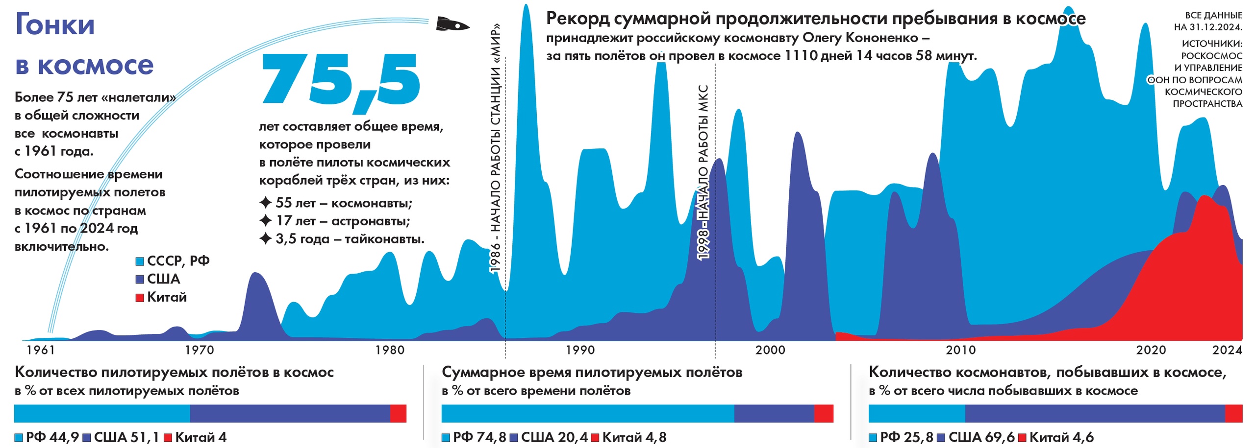 Всего в открытый космос выходили 75 космонавтов СССР и России. Мировой рекордсмен – Анатолий Соловьёв. На его счету 16 выходов в открытый космос – 78 часов 46 минут.