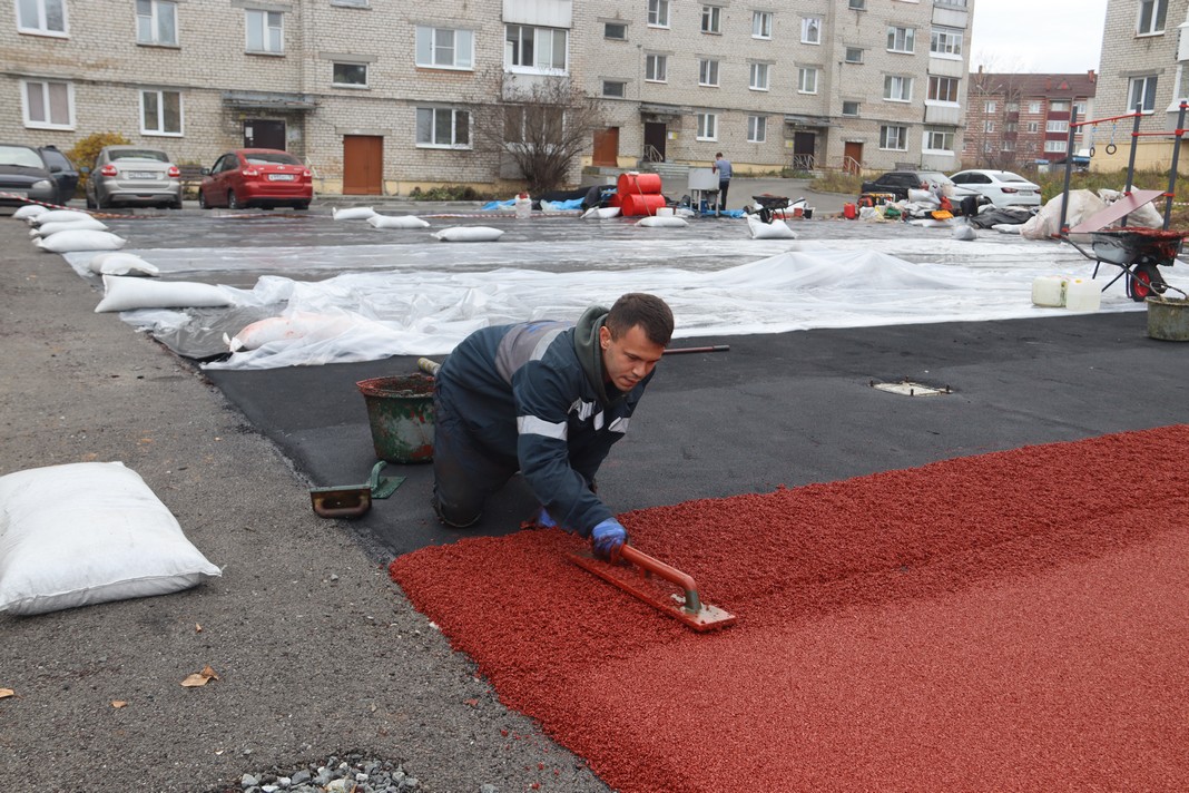 В большом дворе домов ул. Шевченко, 1а и ул. Южная, 7 завершается обустройство детской и спортивных площадок. Здесь идёт укладка резинового покрытия и установка уличных тренажёров и игровых комплексов.