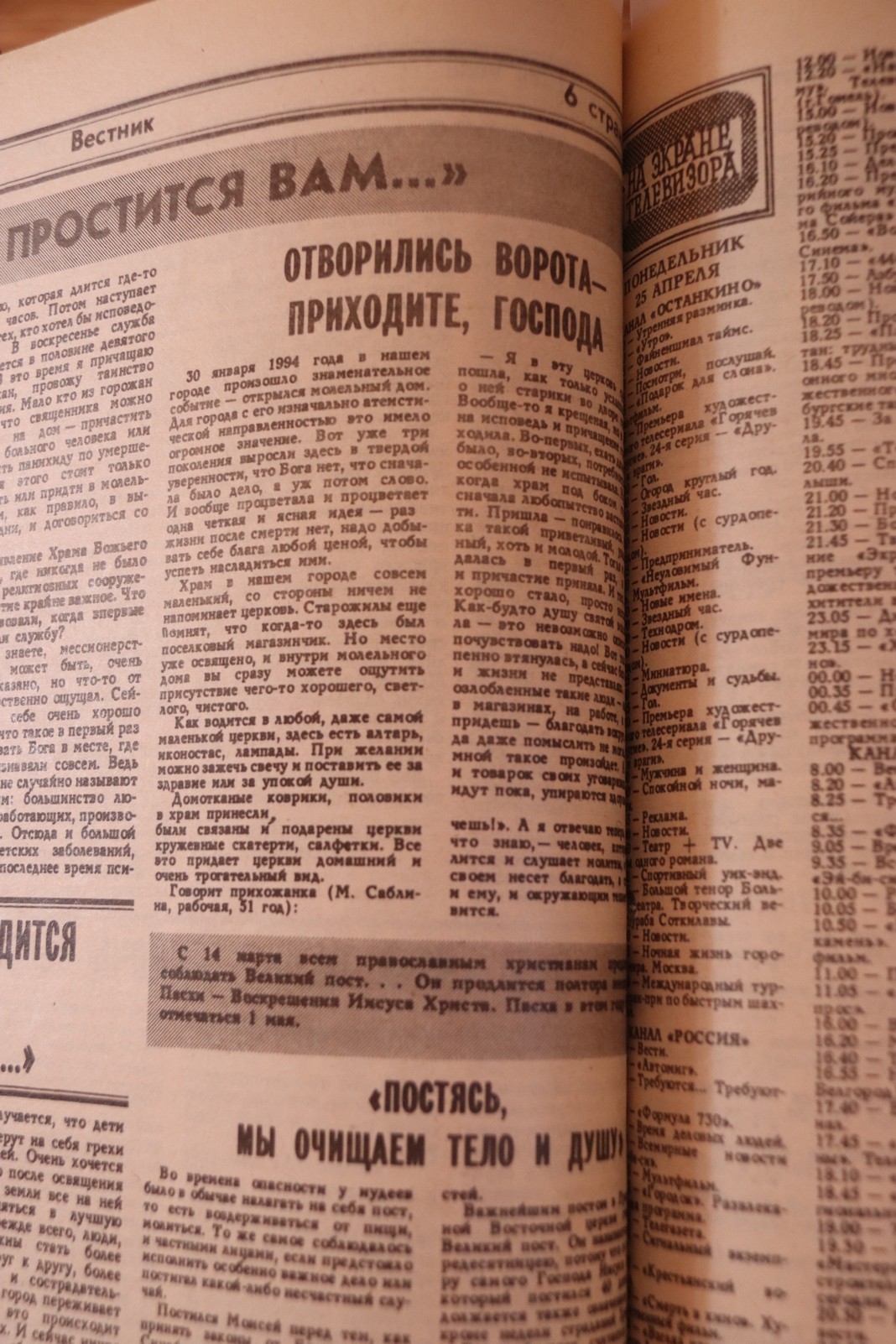 Вместе со всей страной духовное восхождение совершали и лесничане. Одно из ранних упоминаний об этом встречается на страницах «Вестника» в выпуске № 16 (244) от 22 апреля 1994 года. Несмотря на ироничный заголовок, серьёзная тема в материале раскрывается с первых строк.