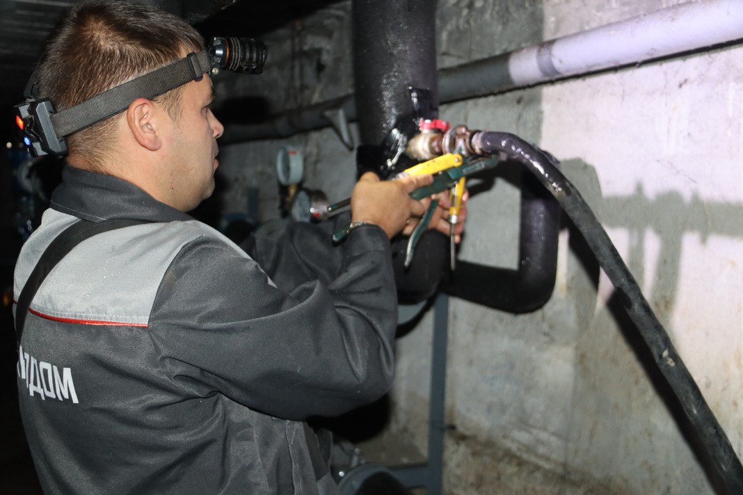 «Для промывки сетей, идущих от теплового узла, требуется около 40 минут. В домах может быть от одного до десяти тепловых узлов. По согласованному с ресурсоснабжающей организацией графику в день мы промываем 5-6 узлов и связанные с ними сети», – поясняет Михаил Кузнецов, начальник ремонтно-эксплуатационного управления АО «Технодом». – Система отопления многоквартирного дома всегда заполнена теплоносителем – водой – даже в межотопительный период. Чтобы не произошло застоя, необходимо проводить промывание системы. Для промывки используется гидропневматический метод: компрессор подаёт в систему воздух, который очищает трубы и радиаторы. Процесс завершается, когда вода на выходе становится прозрачной. Затем система вновь заполняется водой и готова к приёму тепла».