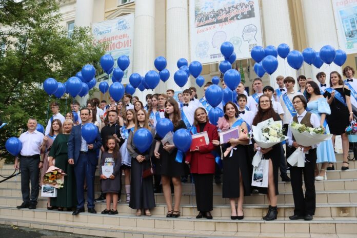 После торжественной церемонии вручения аттестатов выпускники загадывали заветные желания и, по традиции МИФИ, отпускали в небо синие воздушные шары. Ребята поздравляли друг друга с получением первого учебного документа, фотографировались на память, но не прощались, а говорили: «До новых встреч!»
