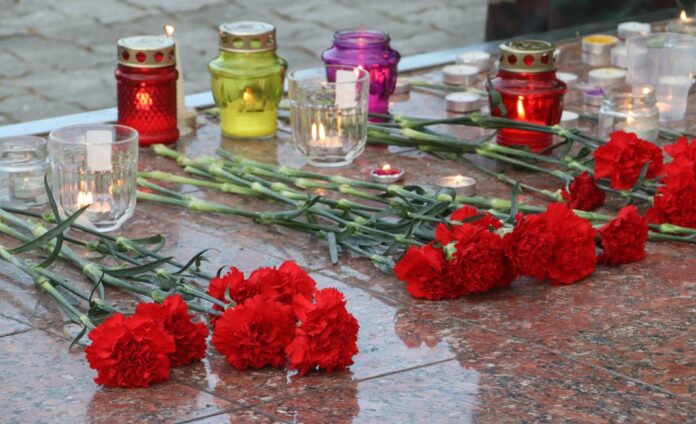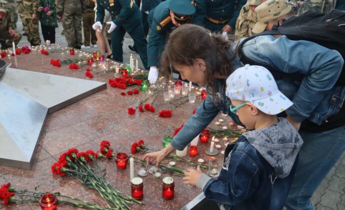 Красные цветы и свечи самых разных форм и размеров обрамили пятиконечную звезду. Как и Вечный огонь, неугасающая людская память сохранит историческую правду и останется главным символом вечной скорби и безграничной благодарности воинам- защитникам.