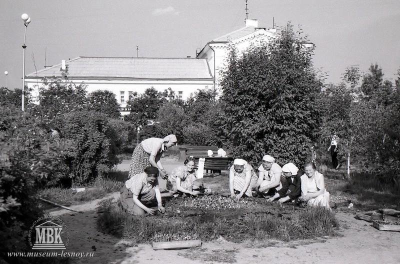 «В мае 1950 года в строящемся Свердловске-45 был проведён воскресник по приведению в порядок площади в центре посёлка, было засыпано болото, сделаны дорожки, высажены первые деревья, позже разбиты клумбы и расставлены скамейки. Так появился наш городской сквер – любимое место прогулок молодёжи в те годы.