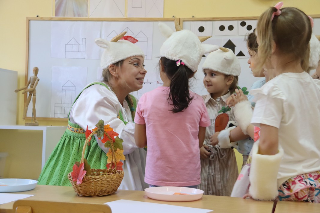 Воспитатель Надежда Головизнина из Заречного Свердловской области для стажёрского эксперимента выбрала яркий и зрелищный образ Мамы Козы и, едва зайдя в группу, привлекла внимание малышей. Оказалось, чтобы отправиться на ярмарку, надо взять с собой овощи. И вот уже маленькие «козочки» пытаются определить, какая из морковок самая большая. Весёлая игра научила ребят сравнивать и измерять предметы, раскладывать по величине. Дети остались довольны, а вот педагог к результатам своего нового опыта отнеслась критично: «Сегодня мне, к сожалению, удалось решить не все задачи, – призналась Надежда. – Но стажёрские пробы – это практика, а значит, обязательно будет польза. В нашем детском саду внедрено уже многое из того, что удаётся почерпнуть на встречах, организованных «Школой Росатома». Теперь привезём домой ещё одну интересную технологию».
