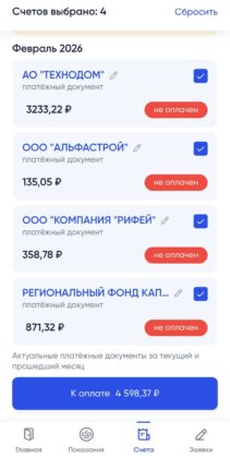 Для оплаты счетов за ЖКУ на главном экране приложения необходимо выбрать соответствующий пункт. Приложение отобразит все начисления по счёту, разбитые по видам услуг. Далее можно выбрать ресурсоснабжающую или коммунальную организацию, по счетам которых необходимо произвести платёж, и нажать на кнопку «К оплате».