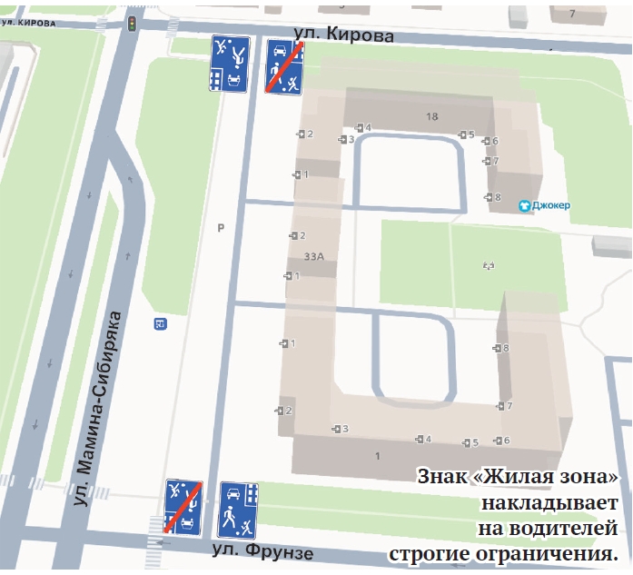 Так как территория считается придомовой, членами комиссии принято решение установить здесь знаки 5.21 «Жилая зона» и 5.22 «Конец жилой зоны». Тем временем в Правилах дорожного движения чётко сказано: сквозной проезд в жилых и дворовых территориях запрещён. За нарушение такого запрета предусмотрена ответственность, включая штрафы – 1500 рублей (ст. 12.28 КоАП РФ). Кроме того, в жилых зонах максимальная скорость движения – 20 км/ч, а преимущество в движении – у пешеходов.