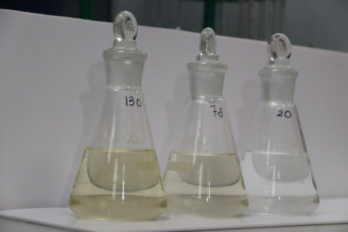 Перед нами три колбы с числами – 130, 78 и 20 – это обозначение градусов цветности воды. Это один из показателей качества воды, который измеряется в градусах по хром-кобальтовой шкале, где 20 градусов считается нормой для питьевой воды, а более высокие числа свидетельствуют о наличии загрязнений.