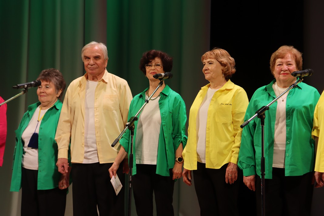 Тем временем зал почти заполнился зрителями. Свет софитов и всё внимание устремлено на сцену, куда под бурные овации уверенно выходят дружные команды. Жесты приветствия, улыбки, вспышки фотоаппаратов – горожане «серебряного» возраста блистают на сцене.