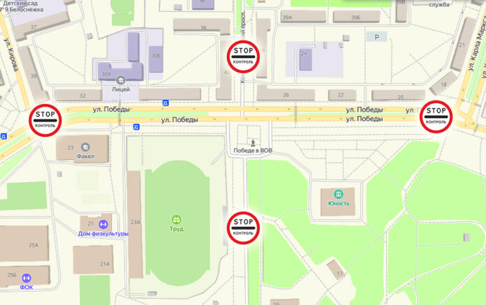 - в районе пешеходного перехода на перекрёстке Карла Маркса – Победы;