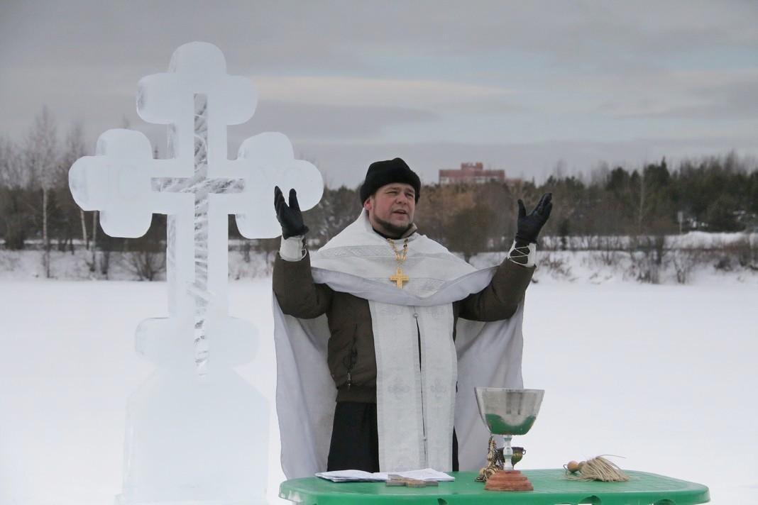Погружаться в ледяную прорубь лесничане начали после чина водоосвящения, который в Крещенский сочельник провёл иерей Алексий Занозин. В тот же день представители Всероссийского общества спасания на водах раздавали всем желающим искупаться памятки о правилах поведения на льду.