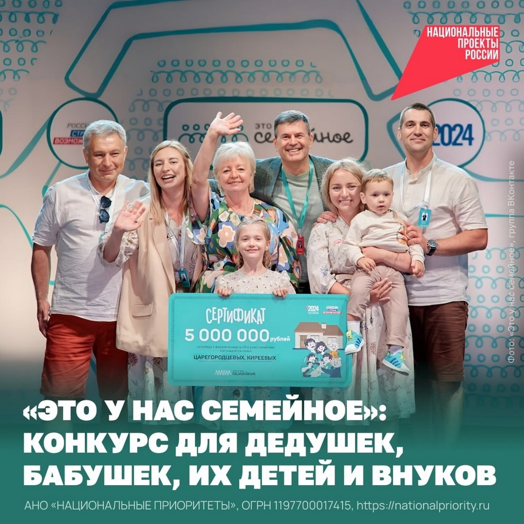 Мечтаете о собственном жилье, грандиозном путешествии по России и других крутых призах для всей семьи? Всё возможно! Соберите команду из трёх поколений: бабушки и дедушки, родители, дети (от 5 до 17 лет) – и отправьте заявку на участие во втором сезоне конкурса «Это у нас семейное» до 14 сентября.