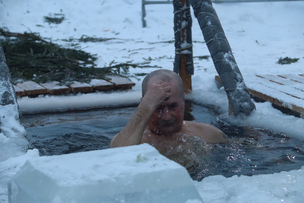 В числе первых к проруби пришли Александр Старков и Сергей Гараев, добрые друзья и коллеги. У обоих уже есть опыт ныряния в ледяную прорубь. «Нет, не моржуем, но работа на водоканале «РИР-Лесной» научила не бояться холодной воды, – хитро улыбается 63-летний Александр Старков. – А вообще я с детства занимаюсь закаливанием и обливаюсь, несколько лет работал и жил на севере. Сегодня -12 градусов, разве этим напугаешь?»
